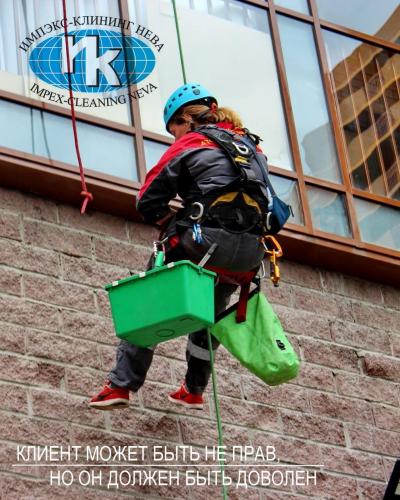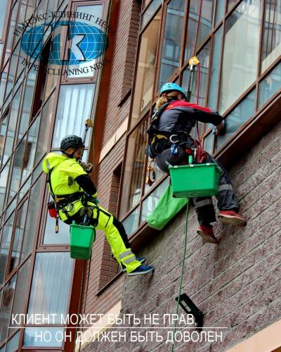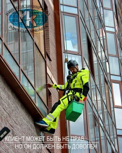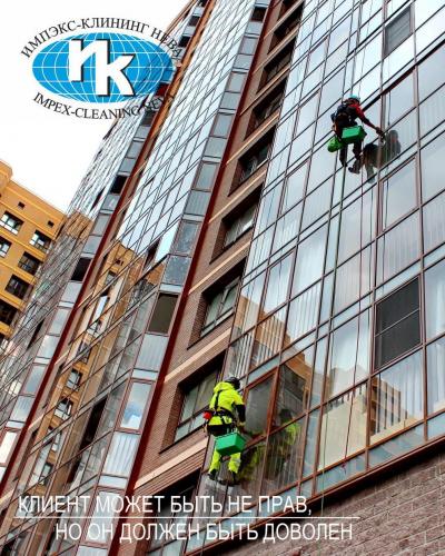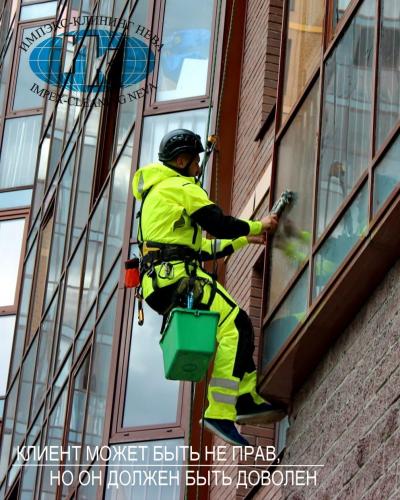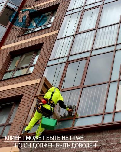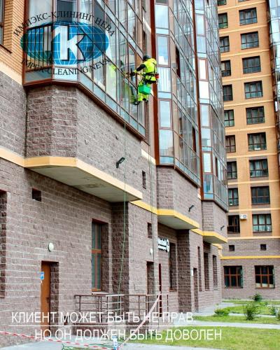 Моем фасады и остекление многоквартирного дома на любой высоте. На высотных домах работают альпинисты. Выполняется как сезонная мойка окон и фасада, так и послестроительный клининг.