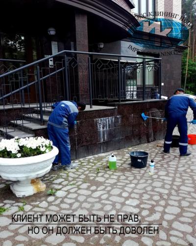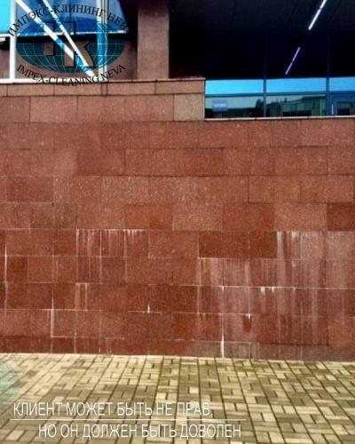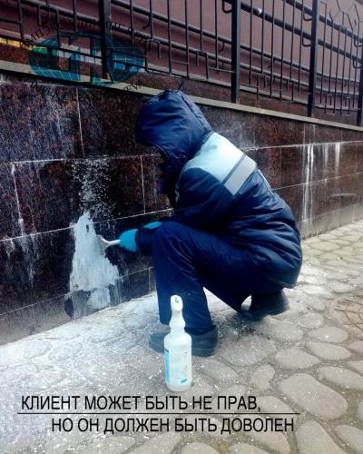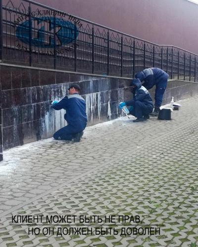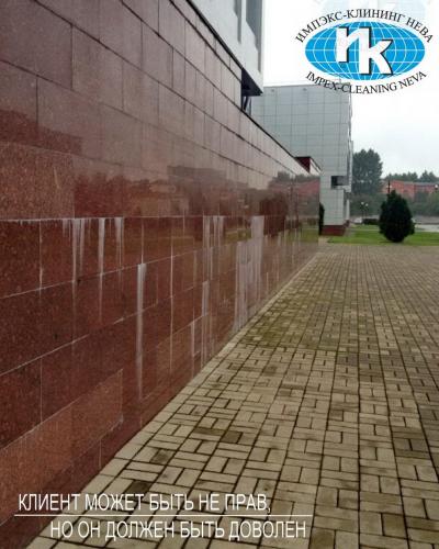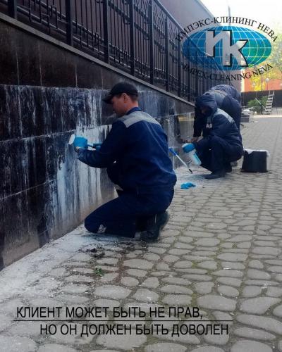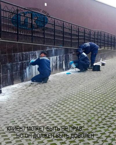 Нашими специалистами регулярно производится не только сезонная чистка гранитной облицовки зданий, но удаление послестроительных загрязнений и нанесение защитной пропитки. С легкостью справляемся с удалением с гранитных поверхностей краски и граффити.