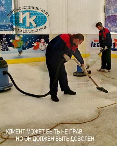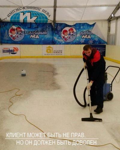 Производим любые клининговые работы, даже самые экзотические. При чистке искусственного льда был использован тот же принцип, что и в химчистке ковролина: профессиональная роторная машина "намыливает" каток профессиональным шапунем, растворяющим все популярные виды загрязнений, после чего грязная пена сразу же быстро собирается водяным пылесосом. Чистка и мойка искусственного льда (синтетический каток), персонал за работой.