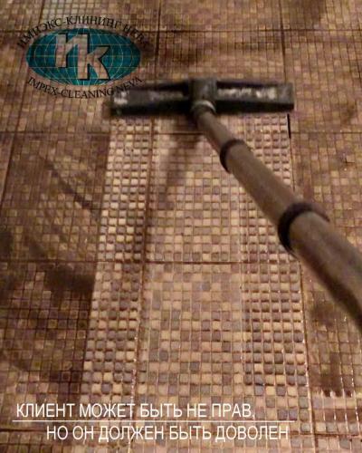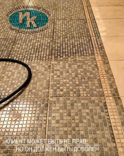 Керамическая мозаичная плитка имеет большое количество швов, которые пачкаются чрезвычайно быстро, причем очистить их подручными способами - невозможно. При чистке керамической мозаики применяется комбинированный способ выполнения работ: основная часть покрытия обрабатывается роторными машинами, наиболее загрязненные участки, а также швы очищаются вручную до достижения идеального результата.