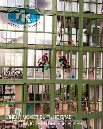 При необходимости работы на высоте к работе привлекаются промышленные альпинисты-клинеры. Большой опыт и профессиональное оборудование позволяет быстро помыть окна многоквартирного дома или производственного цеха, также одновременно с мытьем остекления может быть помыт фасад здания.