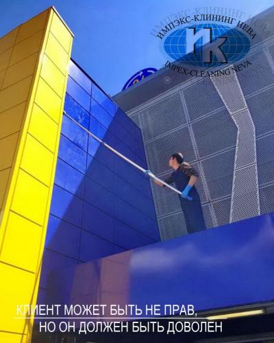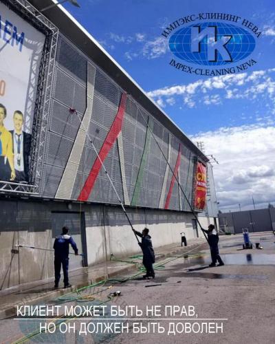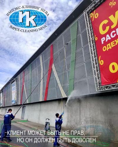 Мытье фасада гипермаркета одновременно с мойкой витрин и остекления, СПб: