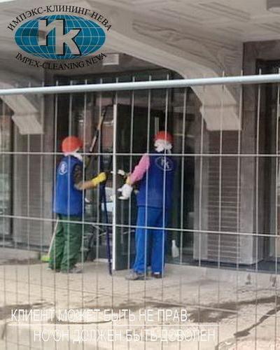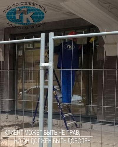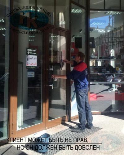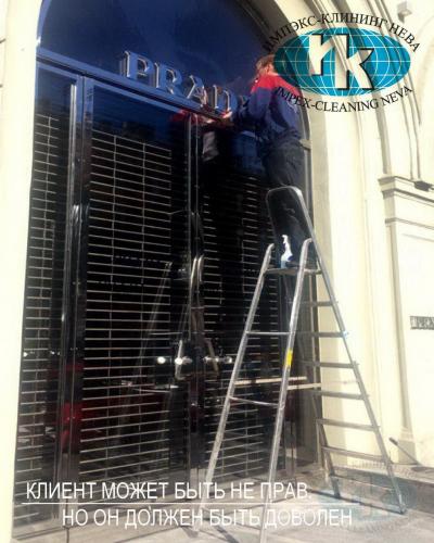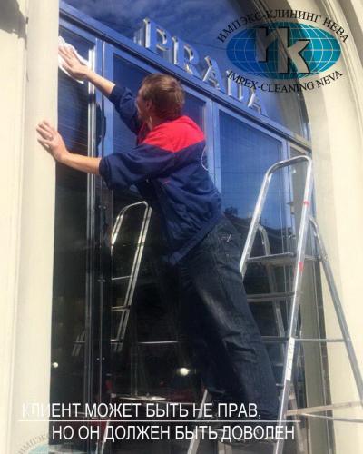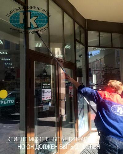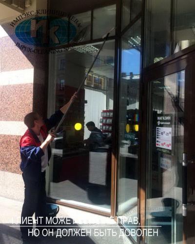 Чистка остекления входной группы в магазине СПб, персонал за работой: